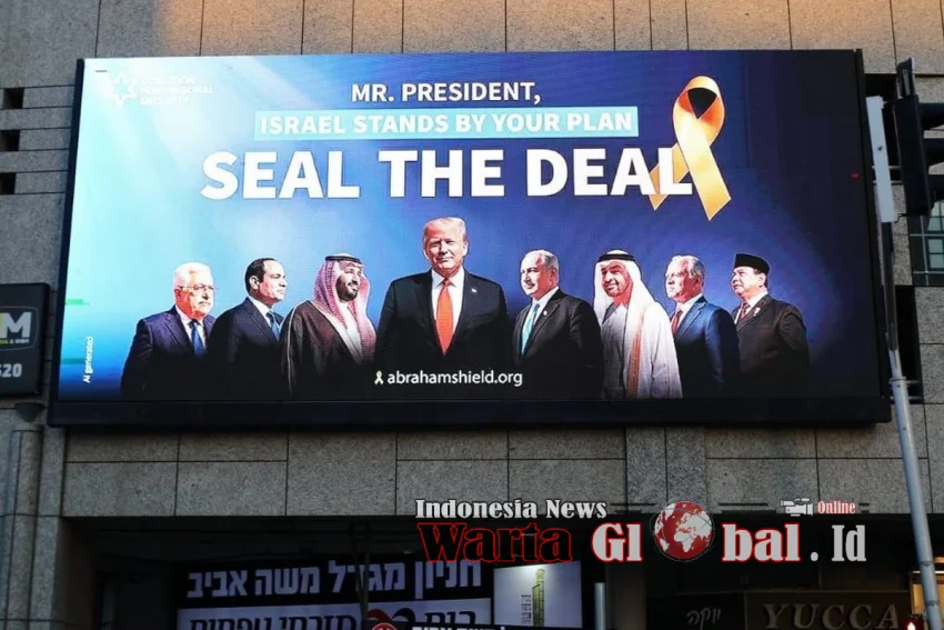 Presiden RI Prabowo Subianto muncul di baliho Abraham Shield yang dipajang di Israel bersama Benjamin Netanyahu, Donald Trump, dan pemimpin negara Arab lainnya. |