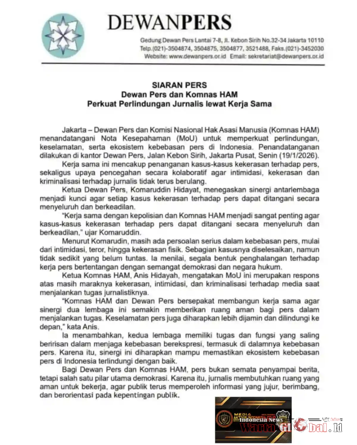 Penandatanganan MoU tersebut berlangsung di Kantor Dewan Pers, Jalan Kebon Sirih, Jakarta Pusat, Pada Hari Senin (19/01/2026). Kerja sama ini menjadi respons atas masih maraknya intimidasi, kekerasan, hingga kriminalisasi terhadap jurnalis saat menjalankan tugas jurnalistik.