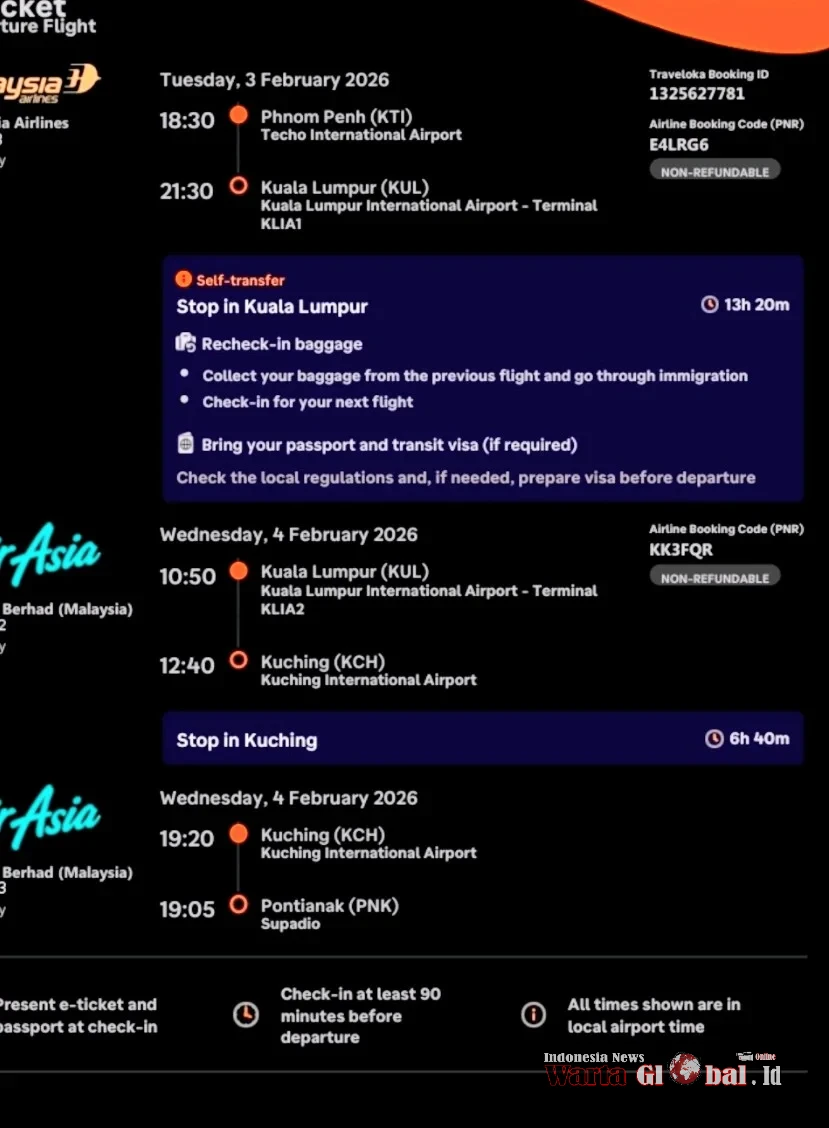 Inilah kenyataan pahit yang dialami Marianus Daniel, Pekerja Migran Indonesia (PMI) asal Kabupaten Sanggau, Kalimantan Barat. Warga Dusun Mak Pompong, Desa Janjang, Kecamatan Tayan Hulu ini kini terlantar di trotoar Phnom Penh, tidur di kaki lima Kedutaan Besar Republik Indonesia (KBRI), menanti belas kasih negara.Kronologi tragis bermula Rabu, 3 Februari 2026, di Bandara Internasional Phnom Penh. Marianus siap lepas landas dengan Malaysia Airlines MH763 rute Phnom Penh-Kuala Lumpur pukul 18.30. Rute lanjutannya sempurna: