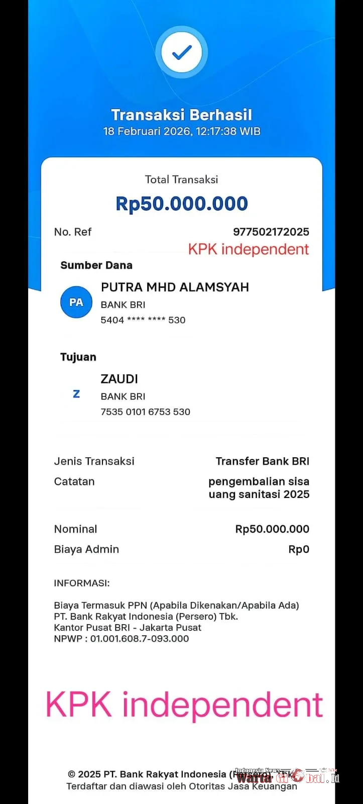 Dari total dana yang dialihkan, supplier hanya mengambil pembayaran sesuai nilai material yang benar-benar dipesan, yakni sekitar Rp5 juta per penerima manfaat.